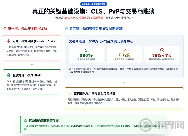 "关键基础设施是CLS/PvP和交易商的FX掉期账簿,其中隐藏着80万亿美元以上的美元债务,而不是AMM和钱包。"