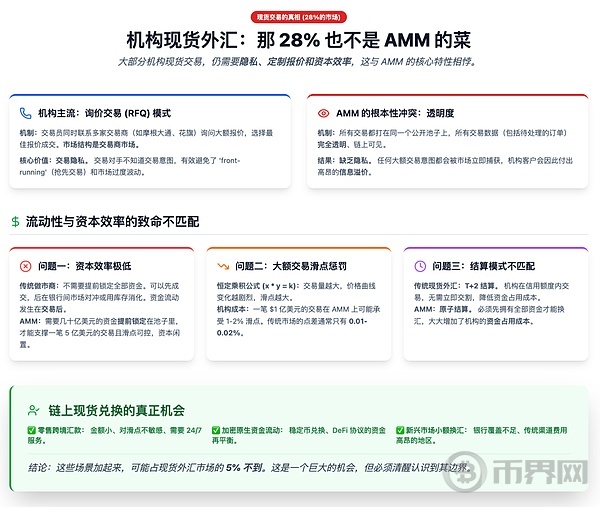 机构现货外汇主要通过RFQ(询价交易)完成,隐私是核心需求,而AMM的链上透明性恰恰是机构最不想要的