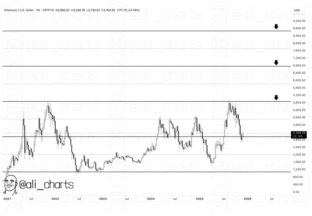 2025 年 12 月 5 日,Fundstrat 的 Tom Lee 再次预测以太坊 (ETH) 的目标价为 62,000 美元,比目前的 3,170 美元高出 20 倍,这引发了关于以太坊价格预测的争论。