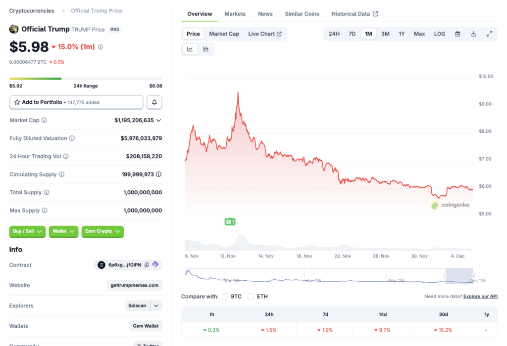 与美国总统唐纳德·特朗普相关的加密货币 Trump Coin(官方名称为 Trump/TRUMP)在过去几个月中遭受了巨大损失。根据 CoinGecko 数据过去24小时内,TRUMP的价格下跌了1.5%,过去一周下跌了1.9%,过去14天下跌了9.7%,过去一个月下跌了15.2%。TRUMP的价格也较其在2025年1月19日创下的历史最高点73.43美元下跌了近92%。受此影响,TRUMP的市值已跌至第93位。接下来,我们将探讨该加密资产能否在未来几周内重拾涨势。