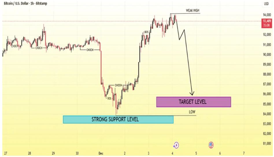 EliteGoldAnalysis 在图表上勾勒出一个价格结构,该结构以一个较弱的高点开始,这种技术状况通常反映了反转前的流动性抢占。在接近顶部时出现较弱的高点比特币最近的上涨行情这表明买家可能在市场动能完全转变之前就被抛售了。这种形态伴随着一个不断降低的高点,暗示着……正在形成看跌结构.