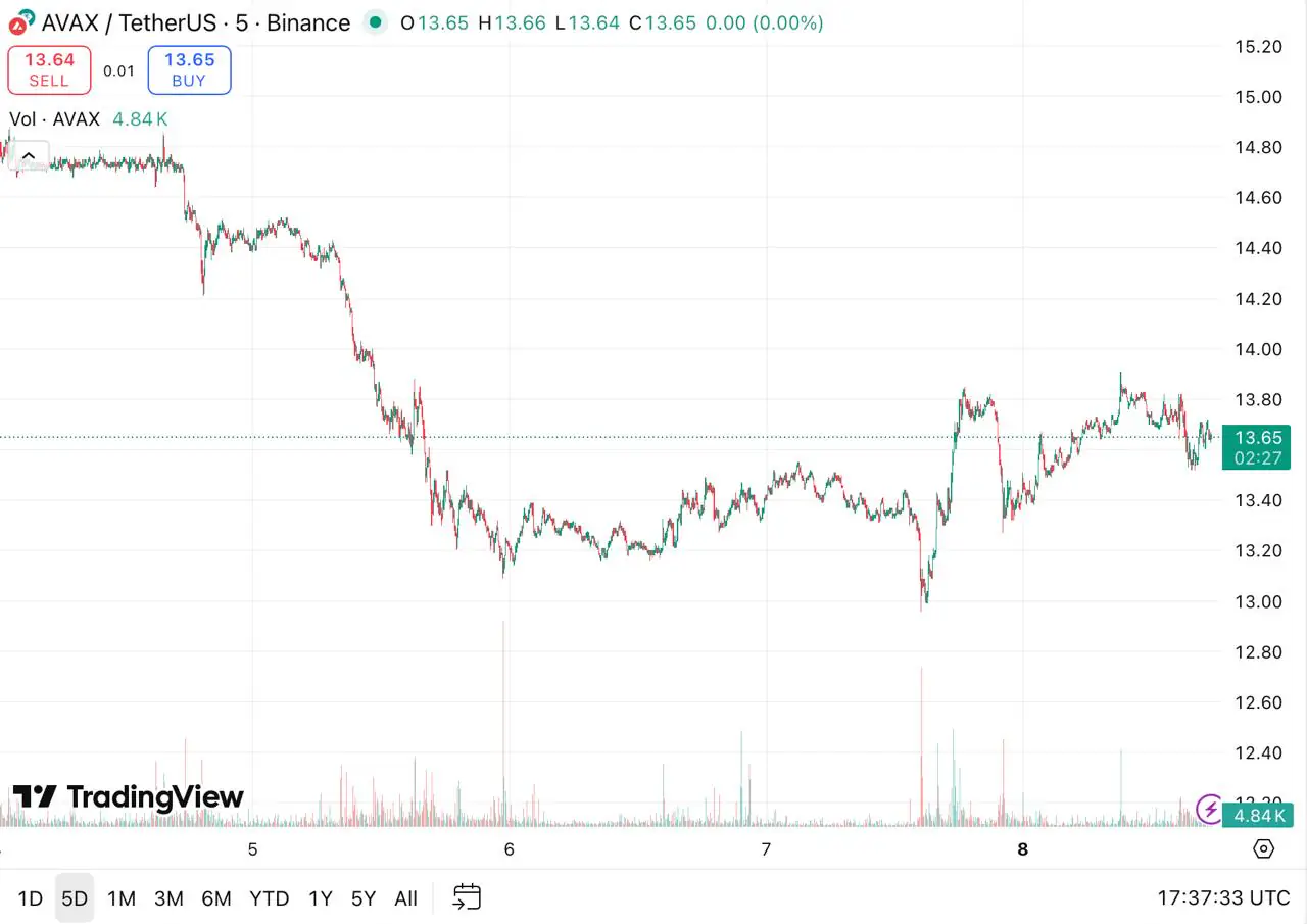 过去五天,Avalanche (AVAX) 股价从 14.80 美元至 15.00 美元区间大幅下跌,跌破多个支撑位后企稳于 13.20 美元附近。在形成一个宽阔的盘整底部后,AVAX 开始反弹,并在 7 日出现显著的盘中上涨,标志着价格向更高低点转变,动能增强。尽管目前价格在 13.50 美元至 13.80 美元之间波动,但其走势表明市场早期强势回归,多头正试图收复失地,尽管上方仍存在阻力。