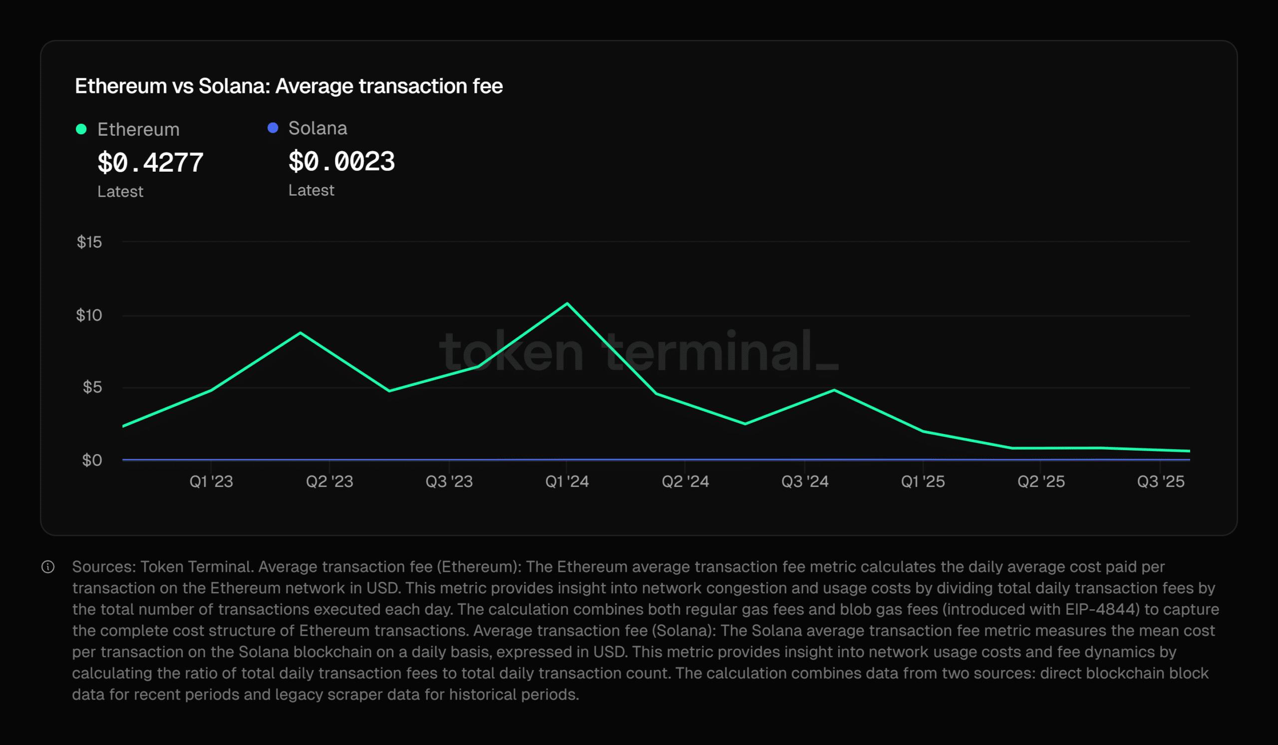 你也可以把它看作是平均值交易费整个区块链上都是如此。对于以太坊来说,其成本一直远高于 Solana。但最近的扩容已经……降低了成本并有助于缩小差距。