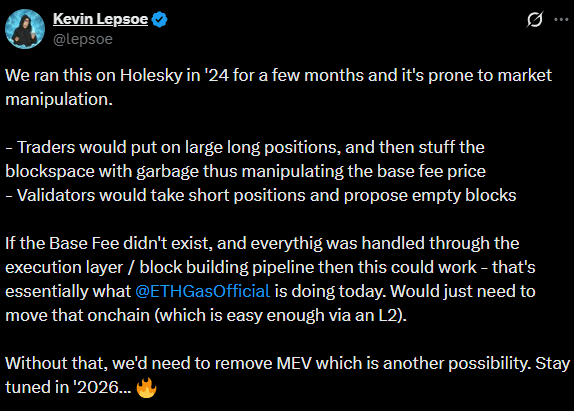Kevin Lepsoe,ETHGas(一个天然气期货市场)的创始人回声Buterin 呼吁这样做,但也警告说验证者可能会操纵基础费用。但他补充说,这种方法在第二层(L2)网络中或许可行。