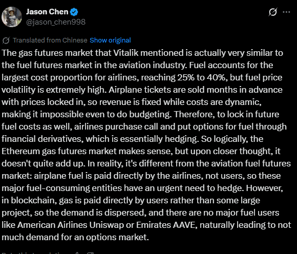 “在区块链中,gas 由用户直接支付,而不是由某些大型项目支付,因此需求分散,没有像‘美国航空 Uniswap’或‘阿联酋航空 AAVE’这样的大型燃料用户,自然也就不会导致对期权市场有太大的需求。”