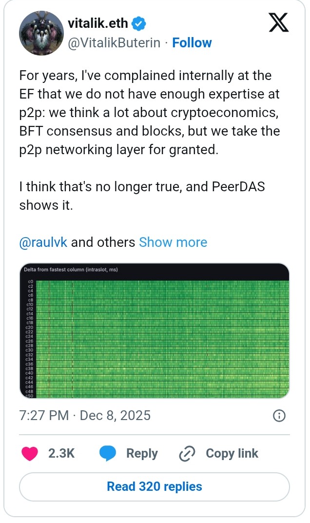 他再次评估了情况后指出,情况已不再如此。他认为,PeerDAS 近期的表现证实了这一点。此外,Vitalik 还赞扬了“制定路线图,同时提高网络弹性、速度传播和网络层隐私”的努力。