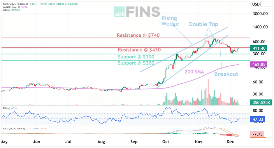 ZEC 价格从上升楔形向下突破,这是一个趋势反转的信号。此外,它在 740 美元附近两次受阻,形成双顶形态,这也是一个看跌的趋势反转形态。目前,ZEC 价格已从 300 美元的支撑位反弹,并正逼近 430 美元的阻力位。如果价格突破该阻力位,则可能表明获利回吐阶段结束,价格有望恢复上涨势头。
