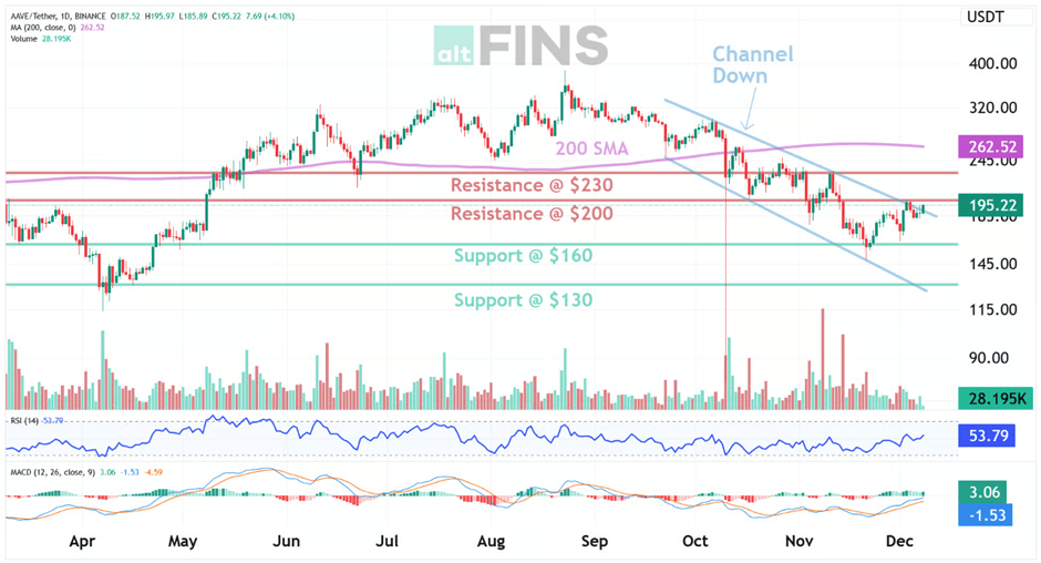 AAVE价格突破了下行通道形态,这可能预示着至少暂时的上涨趋势反转。我们等待确认信号,因为突破200美元阻力位可能会推动价格上涨15%,达到230美元。止损位设在180美元(略低于前期低点)。