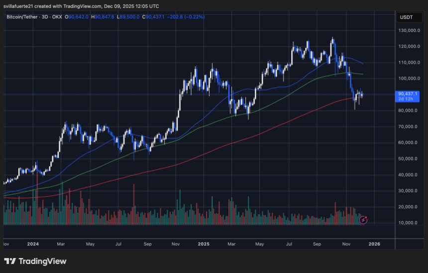 比特币3日图表显示,在经历了一轮剧烈的回调后,市场正试图企稳。目前BTC交易价格在90,437美元附近,略高于200日均线——历史上,该均线在周期中期回调期间一直扮演着重要的动态支撑角色。近期从87,000美元至88,000美元区域的反弹表明,买家正在守住这一区域,但只要价格保持在50日和100日均线下方(这两条均线目前均呈下行趋势),这种结构仍然脆弱。