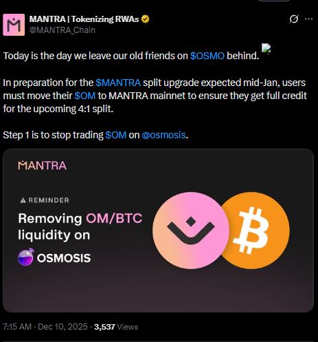 此举是为了配合 MANTRA 计划中的拆分升级。为了在 4:1 拆分中获得全部份额,用户需要将其 OM 代币从 Osmosis 转移到 MANTRA 主网。