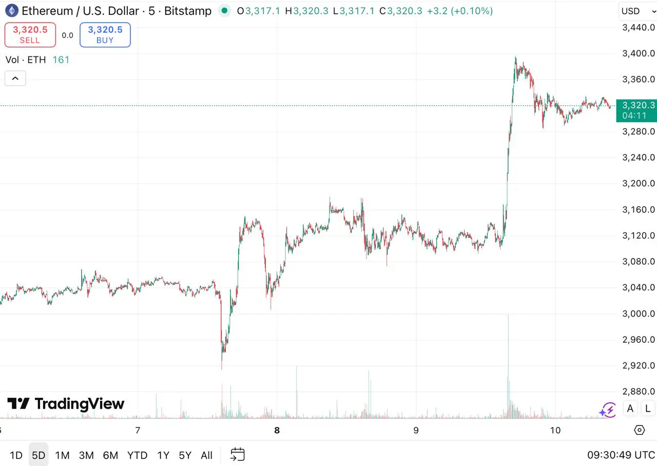 过去五天,以太坊的交易区间相对狭窄,但在8日遭遇一波抛售,价格一度跌破3000美元。随后价格迅速回落,并开始稳步反弹,最终强势突破3350美元,创下本周新高。此次突破得益于成交量的放大以及价格呈现更高的高点和更高的低点,目前以太坊价格在3300美元上方盘整——这是一个令人鼓舞的迹象,表明买方仍然牢牢掌控着市场,且上涨势头正在增强。