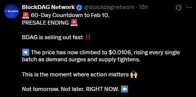 <!--[if ENDBLOCK]><![endif]--> <!--[if BLOCK]><![endif]-->当一个热销的预售项目进入最后60天倒计时时会发生什么?对于BlockDAG来说,答案很简单——紧迫感、强劲势头以及全球投资者的涌入。BlockDAG预售的结束日期现已正式定于2月10日,这标志着其破纪录的上涨行情进入最后阶段,目前BDAG的股价已跌至0.0106美元。