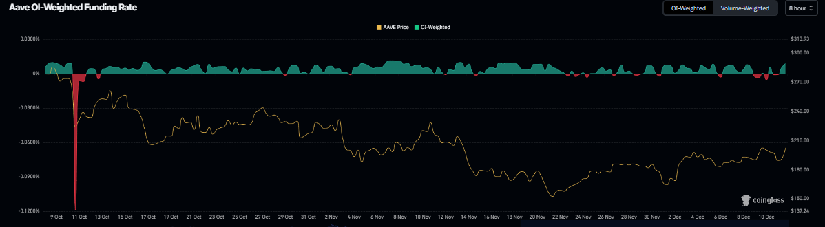在衍生品方面,Aave的融资利率数据也支持价格上涨的迹象。根据Coinglass的未平仓合约加权融资利率数据,押注Aave价格将进一步下跌的交易者数量低于预期价格上涨的交易者数量。
