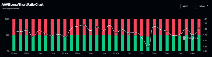 此外,Aave的多空比率周四为1.01,接近月度高点。该比率高于1,反映出市场看涨情绪,因为更多交易员押注资产价格上涨。