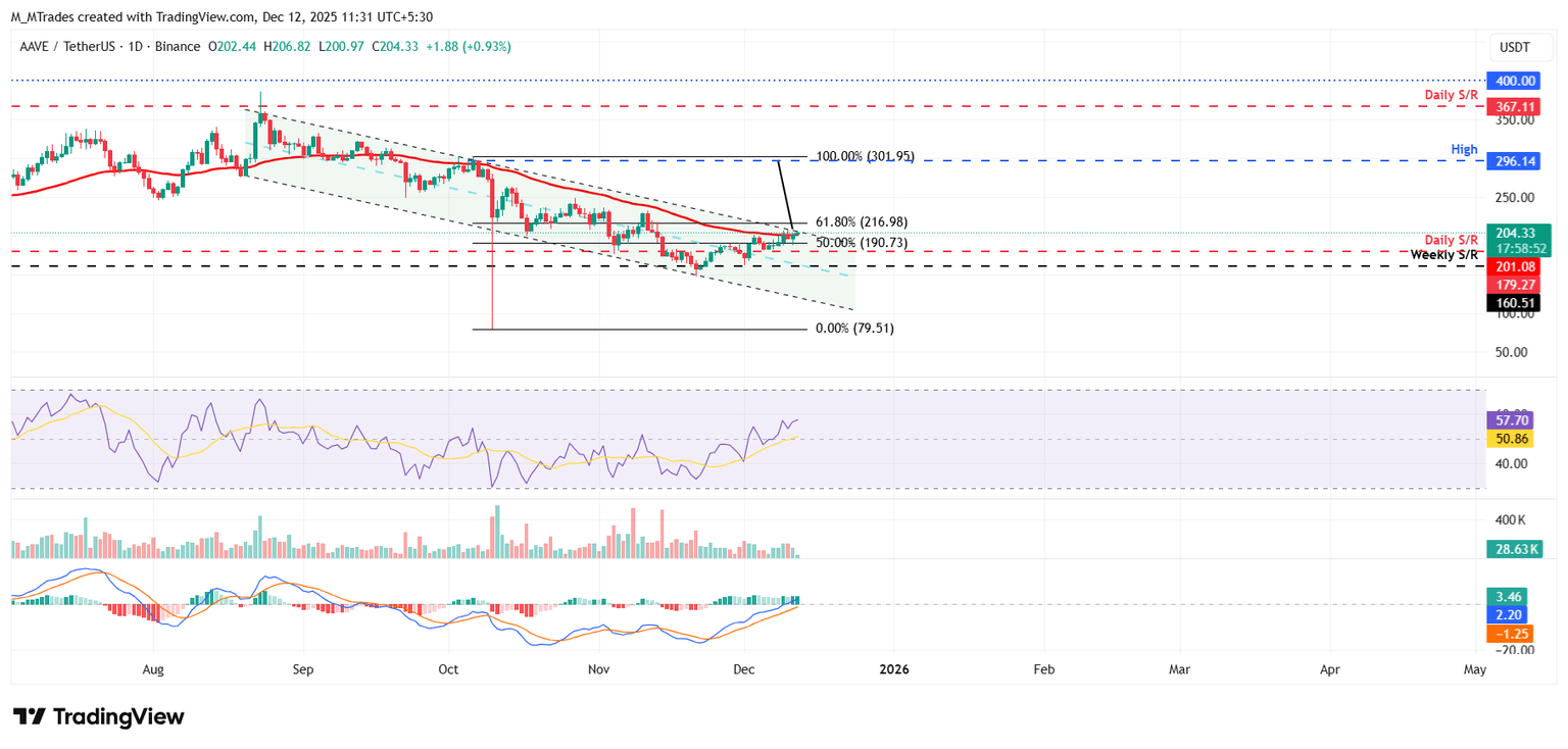 截至周五发稿时,Aave (AAVE) 价格交易于 204 美元上方,并接近其下降平行通道的上轨;若突破该结构,则有利于多头。此外,链上数据和衍生品数据也支持看涨情绪,而该形态的技术目标位表明价格有望上涨至 296 美元以上。