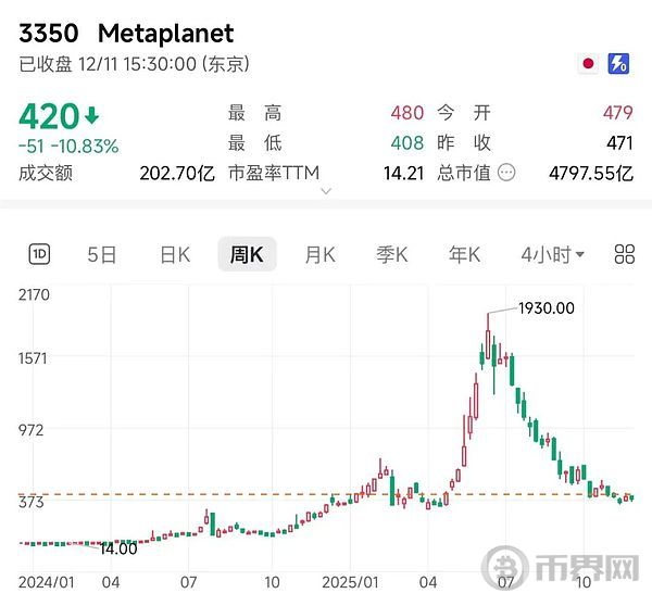 此前,受比特币持有策略影响,Metaplanet 股价曾从 2024 年 4 月的 20 美元飙升至 2025 年 6 月的最高点 1,930 美元。尽管下半年以来股价大幅回落超 70%,但今年整体仍录得超20%的涨幅,目前股价稳定在 420 美元附近,总市值约 30 亿美元。