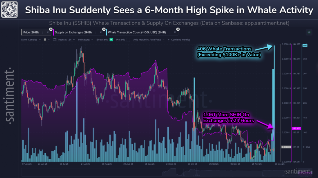- 最新的 Shiba Inu 新闻显示,SHIB 记录到鲸鱼活动急剧增加,大额交易超过 400 笔。