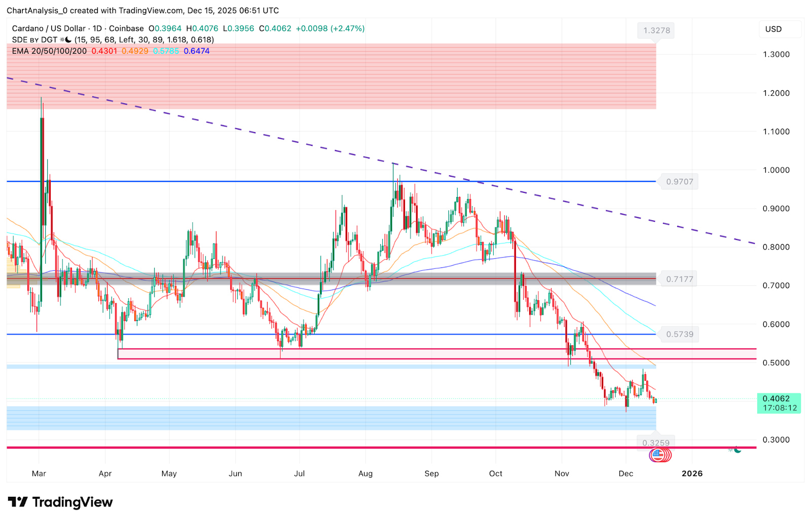 卡尔达诺 (Cardano) 价格今日在 0.406 美元附近交易,此前价格从过去两周限制其下跌的关键需求区域小幅反弹。此次反弹是在 11 月份的暴跌之后发生的,当时 ADA 跌至年内最低点,迫使卖方放缓抛售势头,而买方则试图将价格稳定在长期支撑位附近。