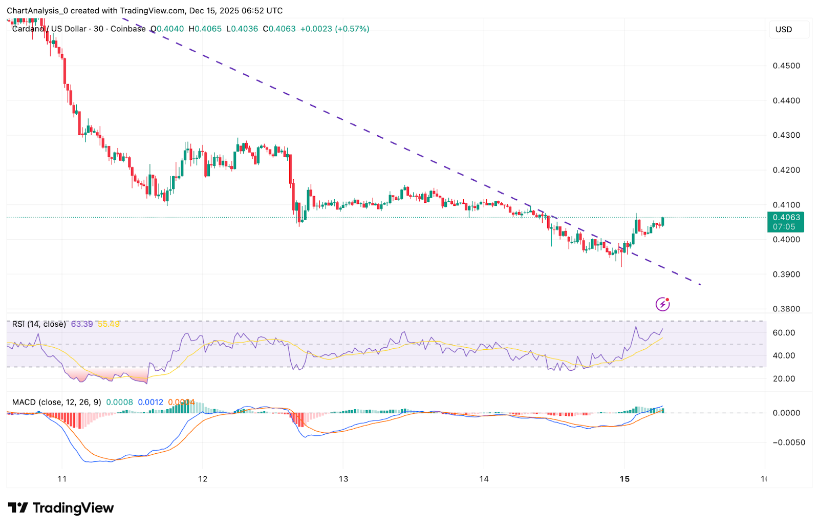 较低时间框架显示抛售压力有所缓解,但市场信心依然薄弱。在30分钟图表上,ADA近期突破了短期下降趋势线,这是自11月初以来的首次技术性改善。