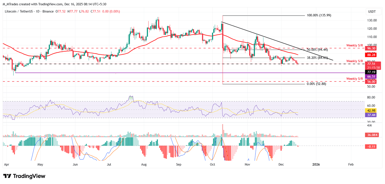 莱特币 (LTC) 周二持续承压,交易价格跌破 78 美元,在关键阻力位受阻后,已连续七天下跌。随着社交关注度下降,动量指标也愈发看跌,下行风险依然占据主导地位。