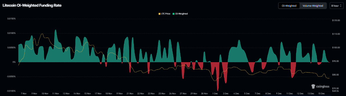 衍生品方面,数据进一步佐证了莱特币的负面前景。Coinglass 的未平仓合约加权资金率数据显示,押注莱特币价格将进一步下跌的交易者数量超过了预期价格上涨的交易者数量。