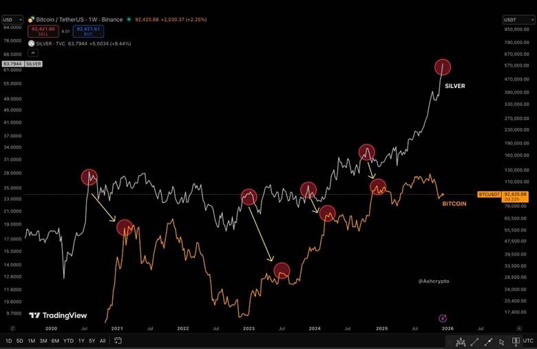 - 白银的抛物线式上涨可能对比特币(BTC USD)有利,而这种背离表明流动性轮动可能很快就会开始。