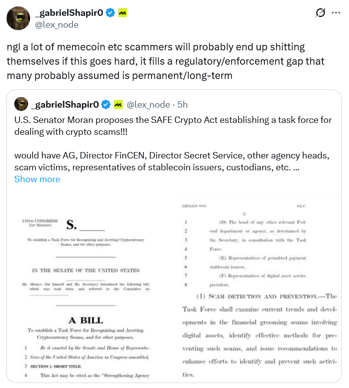 然而,加密货币投资公司 Delphi Labs 的总法律顾问 Gabriel Shapiro 指出,《安全加密货币法案》的成功实施可能会引发加密货币诈骗犯和骗子陷入恐慌。