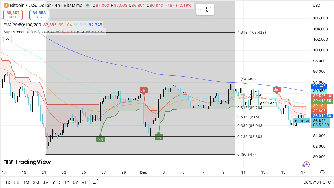 比特币交易价格接近 86,800 美元,反映出其在四小时图上的脆弱结构。价格仍低于 50、100 和 200 周期指数移动平均线。因此,短期动能依然有利于卖方。价格呈下降趋势,高点不断降低,进一步强化了看跌至中性的市场倾向。