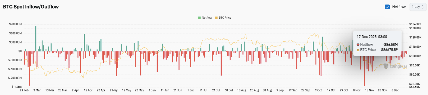 现货资金流入和流出数据也反映了市场情绪的变化。正净流入通常与价格上涨同步,而近期的负净流入则与价格回调同时发生。12月中旬的大量资金流出伴随着价格下跌至86,675美元附近,表明市场持谨慎态度或正在获利了结。