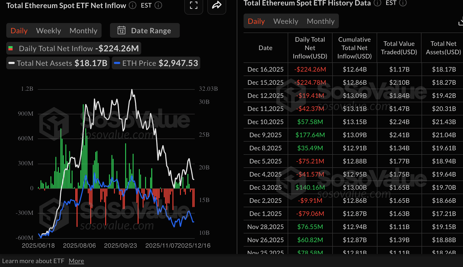 与此同时,以太坊ETF连续第四天出现资金流出,周二约有2.24亿美元流出。贝莱德旗下的ETHA ETF流出金额最大,达2.21亿美元,其次是富达旗下的FETH,流出金额接近300万美元。SoSoValue数据显示,累计资金流入量为126.4亿美元,净资产为181.7亿美元。