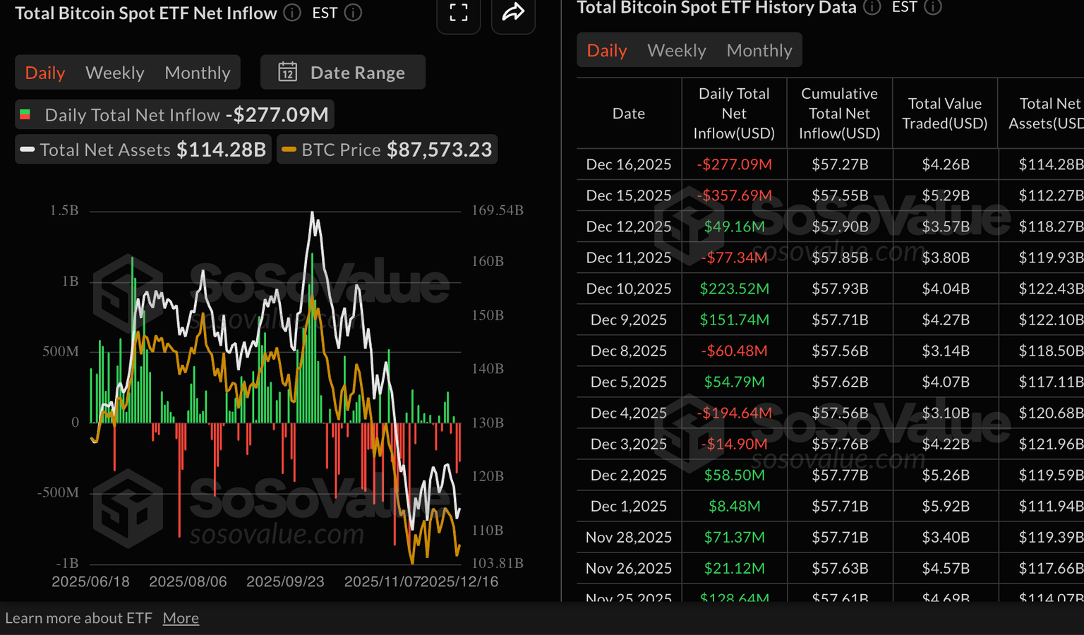 相反,受机构投资者持续避险情绪的影响,比特币现货ETF周二录得约2.77亿美元的资金流出。这是连续第二天出现资金流出,此前投资者在周一撤出了近3.58亿美元。
