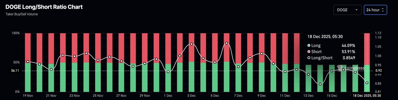 在衍生品方面,随着更广泛的市场波动,狗狗币的走势减弱。加密货币市场正密切关注周四公布的美国消费者价格指数(CPI)和周五日本央行的加息决定。CoinGlass数据显示,狗狗币(DOGE)衍生品的空头头寸已从周三的52.59%升至53.91%。空头头寸的增加反映出卖方交易者占据主导地位,这与过去24小时内狗狗币多头头寸超过500万美元的平仓相吻合。
