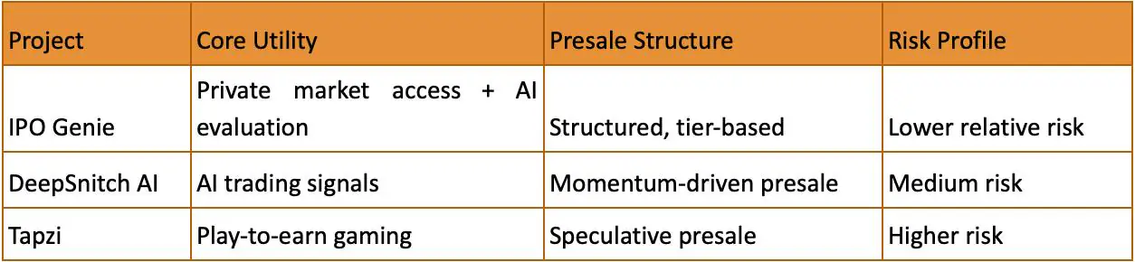 这一比较突显了为什么并非所有新加密货币预售服务于相同的投资者目标。实用性、结构和执行力比故事叙述更重要。