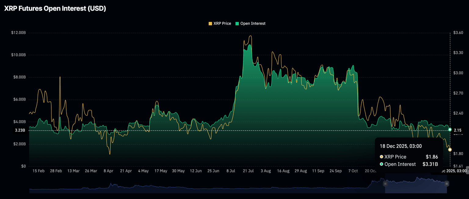 XRP 的散户兴趣大幅下降,这不仅对衍生品市场造成负面影响,而且在更大范围内引发了频繁的抛售。CoinGlass 数据显示,周四 XRP 期货未平仓合约 (OI) 为 33.1 亿美元,低于前一日的 35.2 亿美元和周二的 37.1 亿美元。