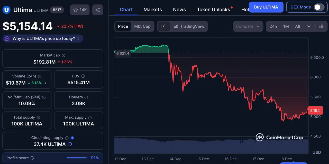 Ultima 的价格是贸易Ultima 币目前价格为 5,150 美元。其反弹尝试疲软,表明当前价位买盘有限。Ultima 币必须重回 5,700 美元至 6,000 美元区间,否则将面临更大的下跌风险。CoinCodex 预计 Ultima 币的价格将……爬到 2026 年 9 月将达到 8,675 美元。