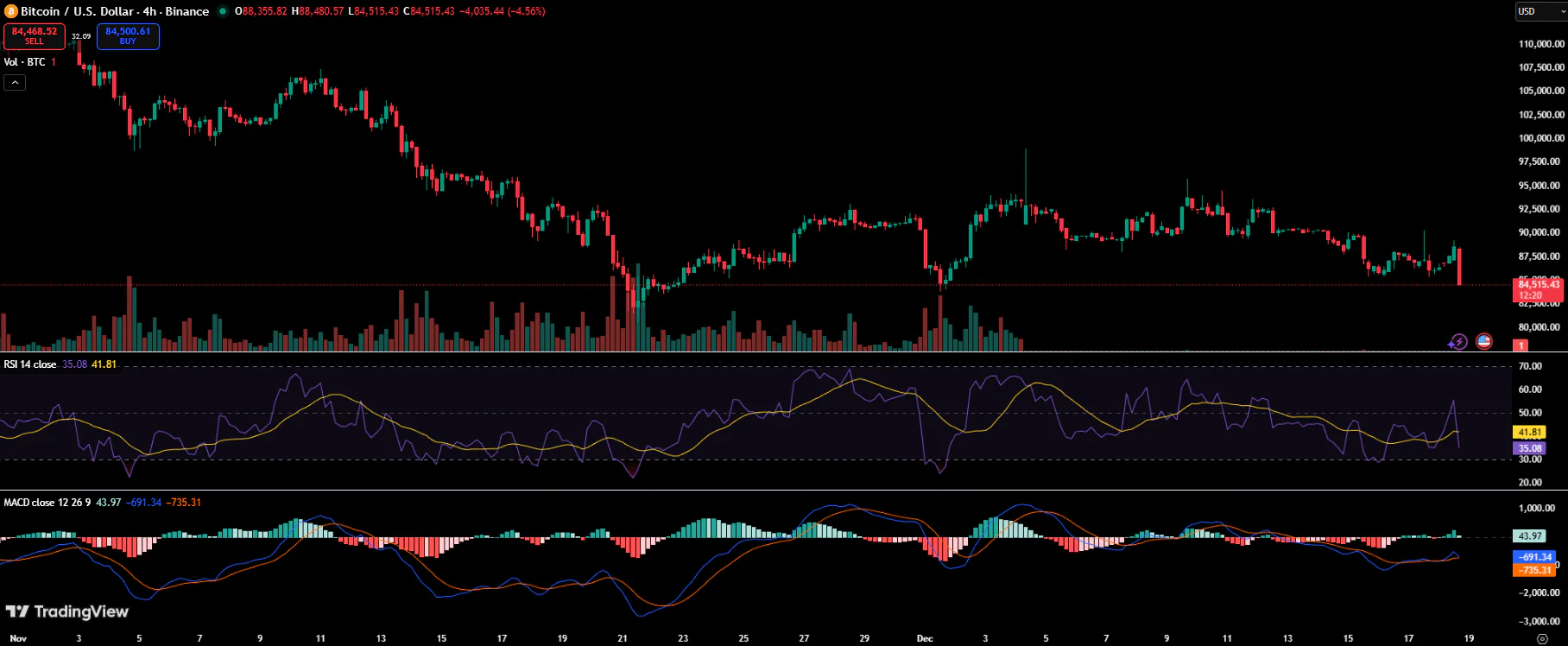 比特币跌至 84,000 美元关口附近,周跌幅超过 7%,而以太坊的七日跌幅更大,超过 13%。市值较大的山寨币普遍下跌,Solana、XRP、狗狗币和 Cardano 的周跌幅均达到个位数至两位数。