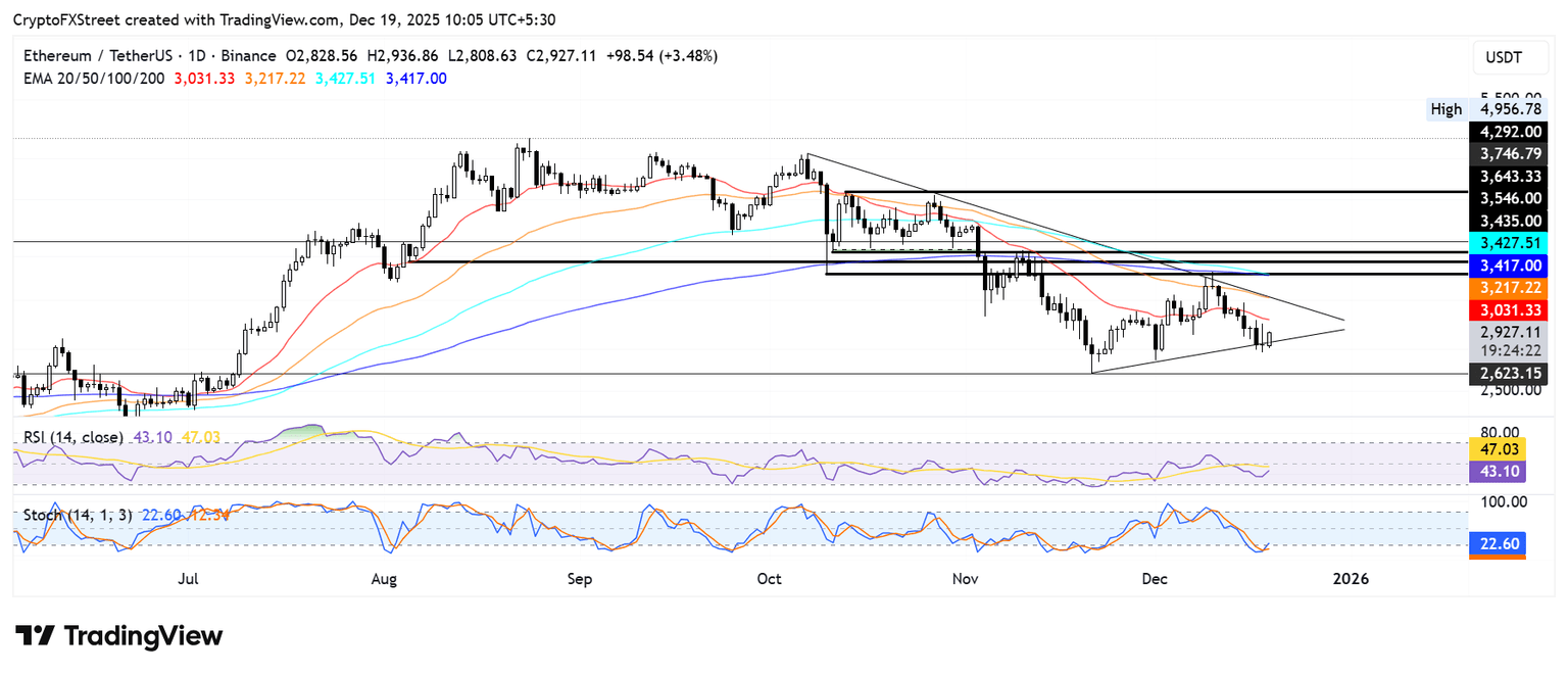 周四,ETH 在 20 日指数移动平均线 (EMA) 处遭遇阻力,价格一度跌破关键对称三角形的下边界。