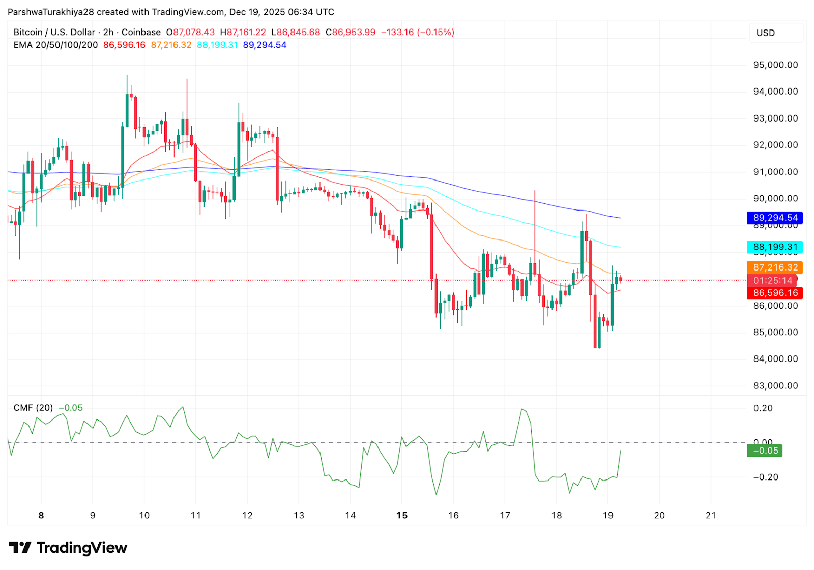较短的时间周期也印证了这一点。在2小时图上,比特币的交易价格低于主要指数移动平均线(EMA),这些EMA紧密地集中在86,600美元至89,300美元之间。