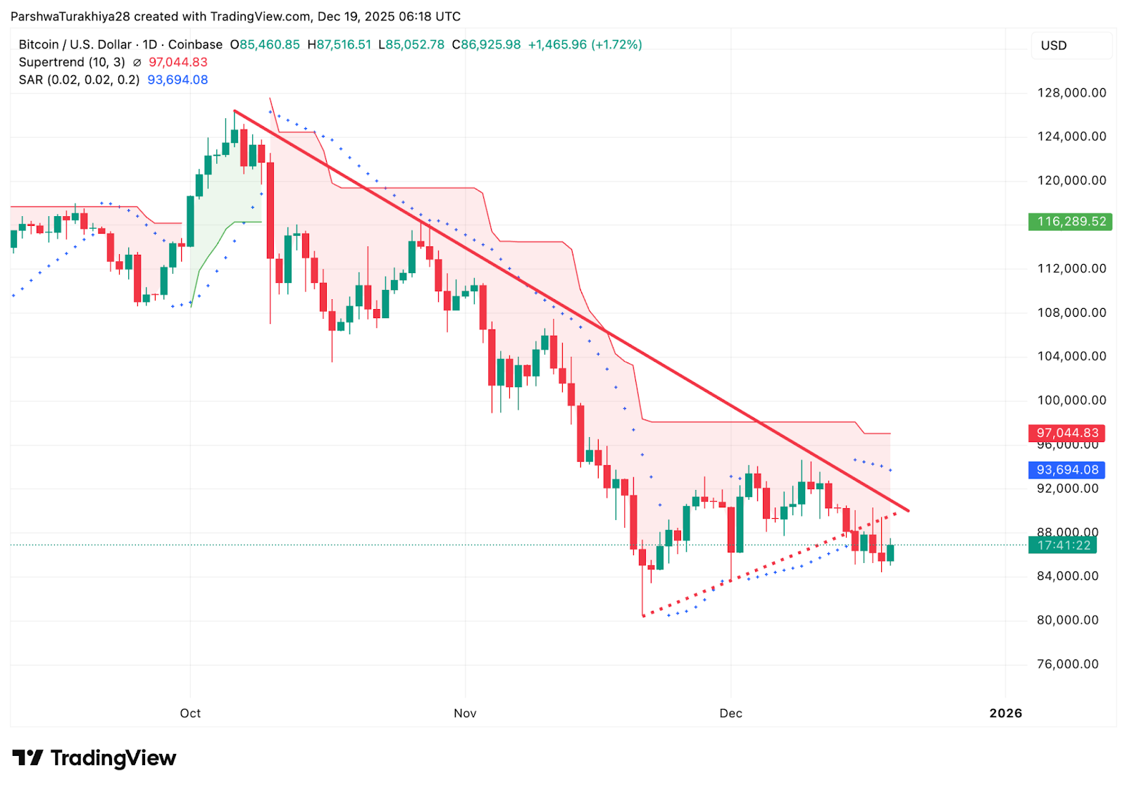 比特币价格今日在 87,000 美元附近交易,此前周中遭遇大幅抛售,价格一度跌至 11 月初以来的最低水平,目前已趋于稳定。尽管买家成功守住了 85,000 美元区域,但由于比特币继续在一条主要的下降趋势线和上方密集的 EMA 均线下方交易,其整体结构依然脆弱。