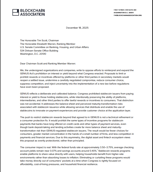 本周,区块链协会牵头开展了一场广泛的行业运动,要求参议院银行业领导人抵制任何试图扩大稳定币收益率禁令范围的努力,使其超出国会立法规定的范围。