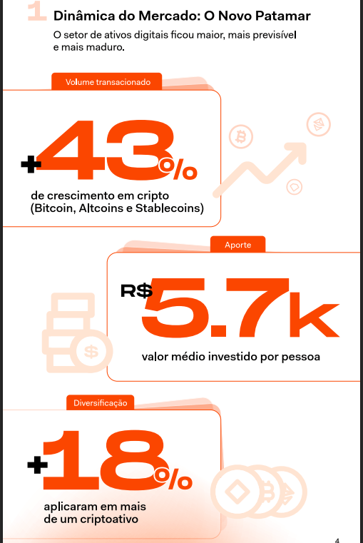 根据报告,巴西市场正在显现出成熟的迹象:投资额不断增长,产品选择范围不断扩大,稳定币在交易和存储中的使用也越来越频繁。
