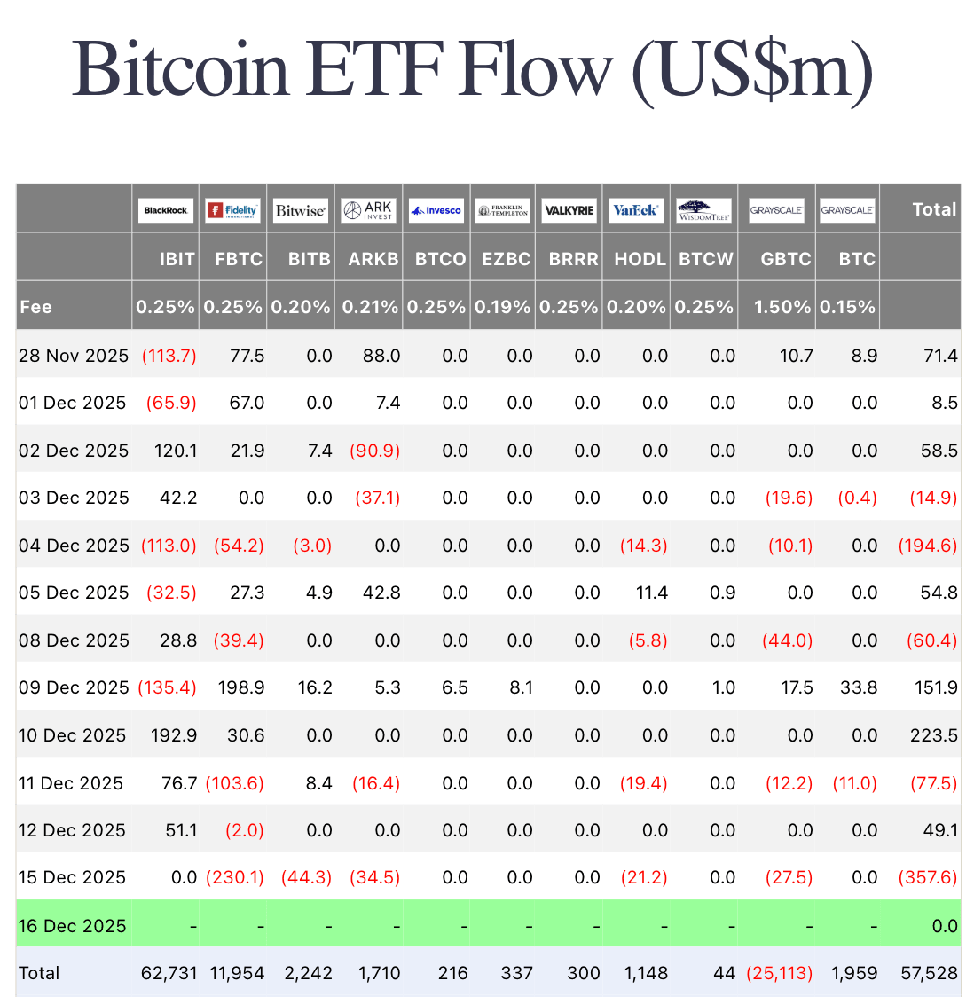 巨鲸投资者中规模最大的机构投资者,例如数字资产管理公司(DAT)和矿业公司,要么抛售了持有的ETF,要么从交易所交易基金(ETF)中撤资。Farside的资金流动数据显示,过去两周ETF的资金一直在被撤出。