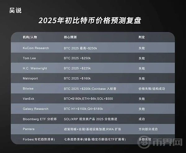 整体来看,2025 年初这批预测的输赢并不复杂:越是押注单一价格点位、且目标越极端(20–25 万),越容易失败;越是押注监管流程、产品供给与行业结构变化,越容易部分或方向性命中。2025 的市场更像是“ 创新高 — 回撤 — 再定价” 的高波动路径:宏观风险与杠杆出清反复打断趋势,使得“ 逻辑正确” 并不必然转化为“ 年底点位兑现 ”;相反,合规产品落地、主流机构参与度提升这类“ 供给侧变化 ”更具可验证性,因此在复盘中表现得更稳。