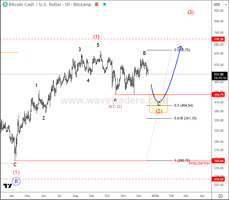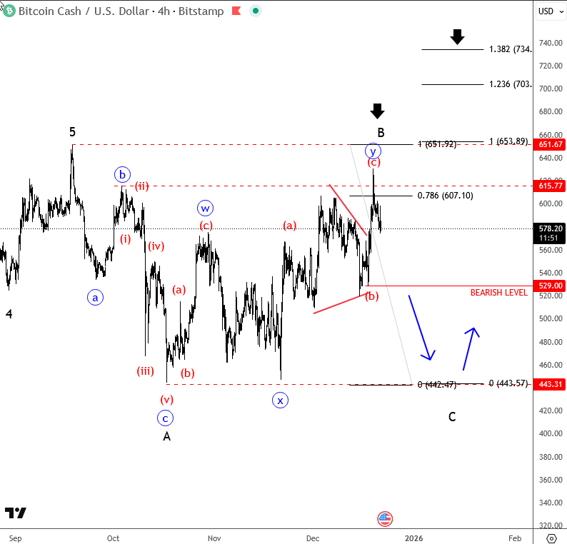 比特币现金过去两个月价格已出现超过 40% 的良好反弹,但值得注意的是,从 443 点开始的走势仍明显重叠,因此它仍可能是更大 A-B-C 调整浪中的 B 浪,横盘整理也是一种可能的情况。这意味着我们应该意识到上涨空间有限,并存在价格反转下跌的风险,甚至可能从当前水平下跌。特别是如果价格跌破 529 点,市场很有可能重新测试 9 月至 10 月价格区间的下限。