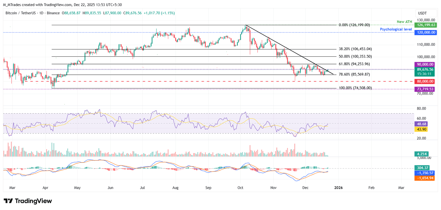比特币价格重新测试后发现支持率为 78.60%。斐波那契周四比特币价格回落至 85,869 美元,并在接下来的三天内反弹了 3.67%。截至周一,比特币正逼近 90,000 美元的关键阻力位。