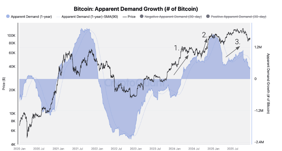 CryptoQuant 的分析师指出:“自 2023 年以来,受美国现货 ETF 推出、美国总统选举结果和比特币国债公司泡沫的推动,现货需求经历了三次主要浪潮,但自 2025 年 10 月初以来,需求增长已低于趋势水平。”