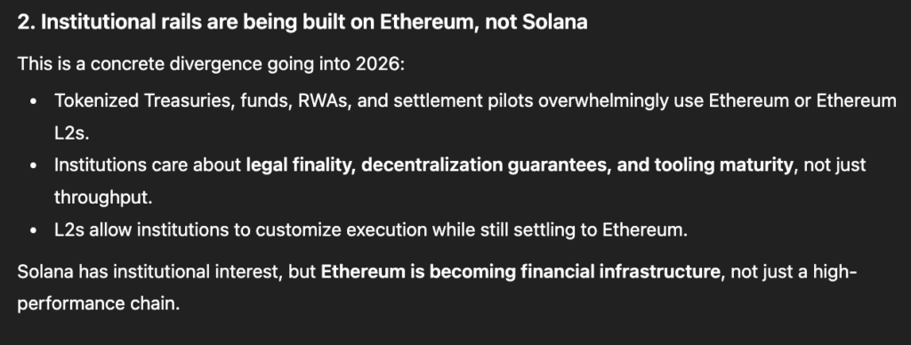 ChatGPT 还观察到机构间差距日益扩大,代币化国库、现实世界资产、基金和结算试点项目都集中在以太坊及其二层网络上。这些用户倾向于法律最终性和成熟的工具,这进一步巩固了以太坊作为核心的地位。金融的基础设施方面,Solana 尚未展现出类似的结算驱动型采用率。