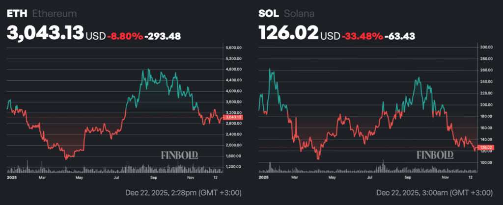 值得注意的是,今年以来,以太坊(ETH)已下跌近9%,截至发稿时交易价格为3040美元。同期,索尔(SOL)下跌了33%,交易价格为126美元。