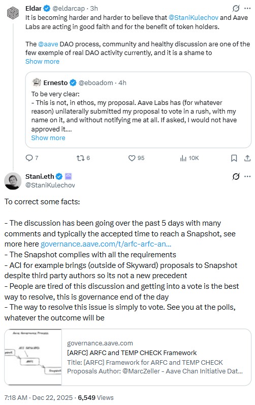 在 X邮政社区成员 Eldar 表示,很难相信 Kulechov 和 Aave Labs 的行为符合代币持有者的最佳利益。