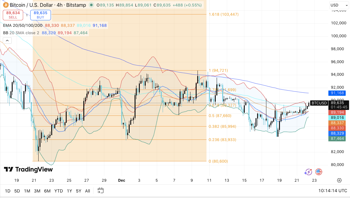 在四小时图上,比特币价格稳定在 89,600 美元附近,交易员们正在权衡技术复苏信号和流动性收紧的状况。此前,比特币成功守住了近期低点,价格反弹,提振了短期信心。